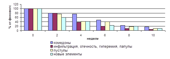 Вместе с тем азелаиновая кислота не обладает такой себосупрессивной способностью, как ретиноиды. Клинически и экспериментально установлено отсутствие ее непосредственного воздействия на морфологию и функционирование сальных желез (Mayer-da-Silva, 1989; Cunliffe W.J, 2000), хотя некоторые авторы (Plewig G., Kligman A.M., 1993.) сообщали, что через 1-2 месяца после начала лечения наблюдали постепенное уменьшение жирности кожи.