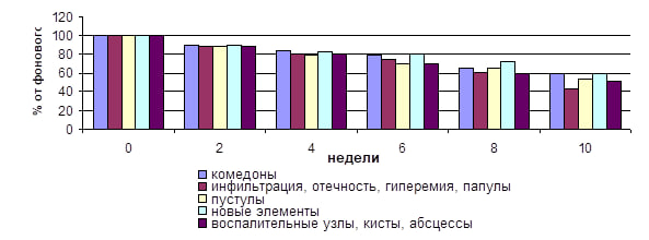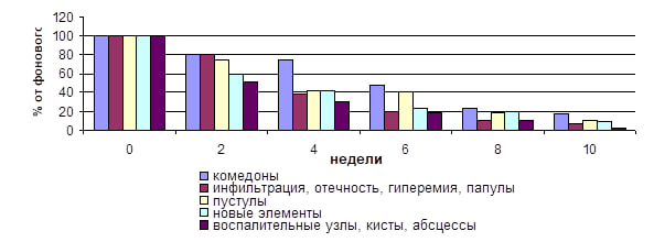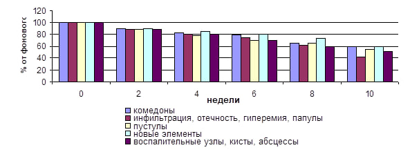 В зарубежной литературе оценивают бензоилпероксид как лучшее местное антимикробное средство для лечения вульгарных угрей, лечебный эффект которого связан с сильным окислительным действием бензойной кислоты. Предлагаются методики сочетания его с топическими антибиотиками для предотвращения развития антибиотикоустойчивых штамов бактерий и увеличения совместного антимикробного эффекта, а также методики комбинированного местного лечения топическими ретиноидами и бензоилпероксидом (Dreno В., 2001). Он не обладает себосупрессивным действием, т.е. не снижает повышенную продукцию кожного сала (АравийскаяЕ.Р. и др., 1998), но ряд авторов указывает на наличие комедолитического и противовоспалительного эффектов (Соколовский Е.В. и др., 1998; Kamasaka B.H., Odiand Р.В., 1992; и др.). В экспериментальных исследованиях бензоилпероксид оказывает сильное контактное раздражающее действие (Mayer-da-Silva, 1989), а в клинических наблюдениях довольно часто отмечают контактный ирритантный дерматит.